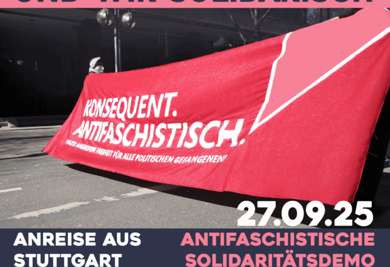 Lasst uns am 27. September gemeinsam nach Nürnberg zur überregionalen antifaschistischen Solidaritätsdemonstration fahren. Damit wollen wir nicht nur Hanna solidarisch beiseite stehen, die am Tag zuvor, wegen ihrer mutmaßlichen Beteiligung an Protesten gegen Nazis 2023 in Budapest, am Oberlandesgericht München verurteilt werden wird,  sondern wir zeigen: Antifaschistmus ist notwendig und wir machen weiter!